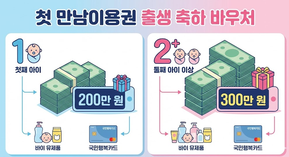 - 이미지 3: 첫째 200만 원, 둘째 300만 원이라는 숫자가 직관적으로 보이는 첫 만남이용권 인포그래픽.