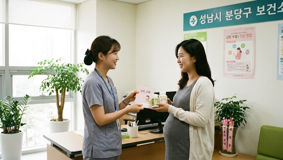 - 이미지 2: 깨끗한 보건소에서 간호사가 산모 수첩과 영양제를 건네주는 다정한 모습.